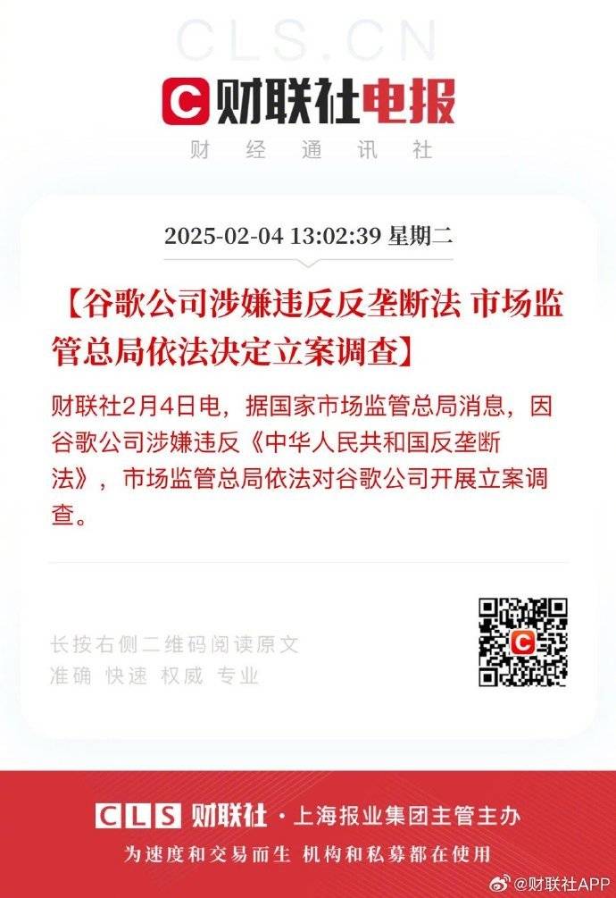 【谷歌公司涉嫌违反反垄断法 市场监管总局依法决定立案调查】据市说新语微信公众号消息,因谷歌公司涉嫌违反《中华人民共和国反垄断法》,市场监管总局依法对谷歌公司开展立案调查。