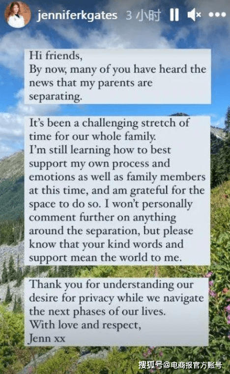 “在过去的27年里,我们共同养育了3名了不起的孩子,并创立了致力于服务全世界的人们健康的基金会。我们将继续坚持信念并在基金会共事,但不认为在人生的余下阶段还能共同生活。希望大家在我们开启新生活之际给予我们空间和隐私。”