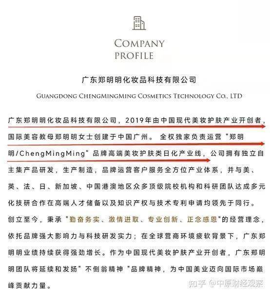 官网显示:广东郑明明化妆品科技有限公司,2019年由中国现代美妆护肤产业开创者,国际美容教母郑明明女士创建于中国广州。