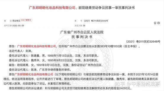 中国裁判文书网显示广东郑明明化妆品科技有限公司身陷两场官司,均与劳动争议有关。