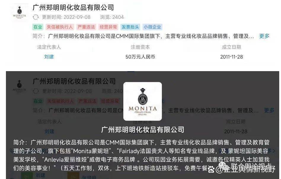 “企查查”信息显示广州郑明明化妆品有限公司是CMM国际集团旗下,主营专业线化妆品品牌销售、管理及教育管理的子公司。但该企业目前是最高人民法院所公示的失信企业,失信金额达484.81万元,历史被执行金额达887.48万元。该公司法定代表人刘建、股东张培艳均为失信被执行人。2021年2月7号广州郑明明化妆品有限公司被广州天河区市场监督管理局列入经营异常名录,处于严重违法状态。