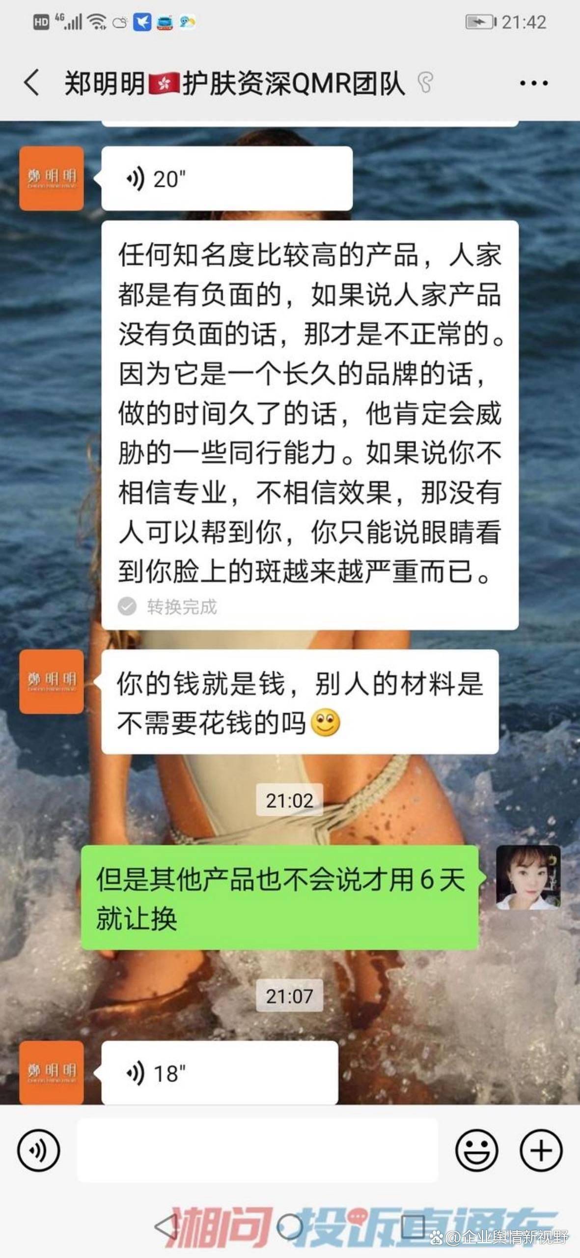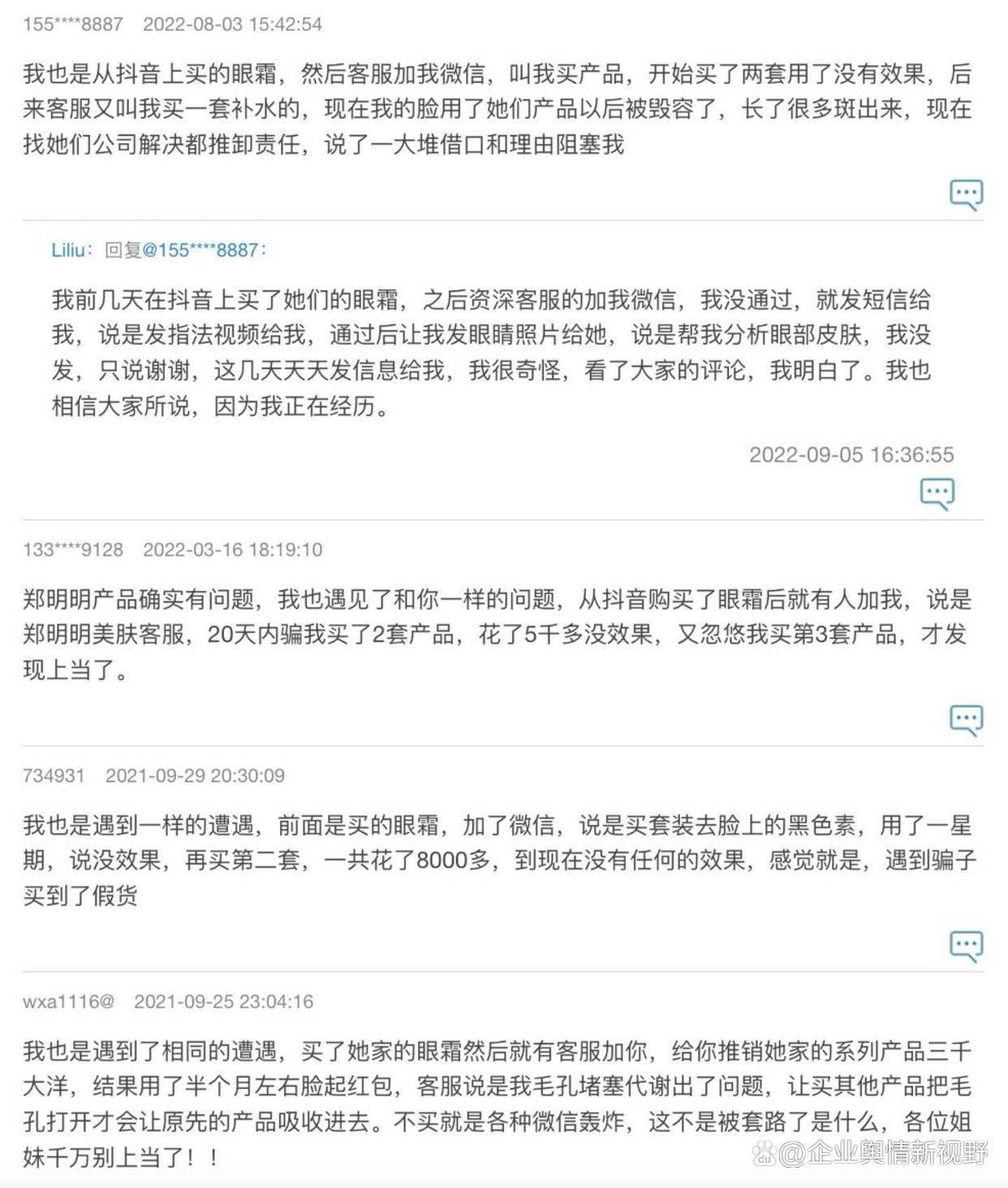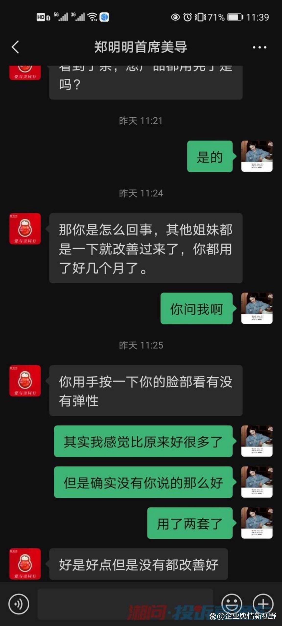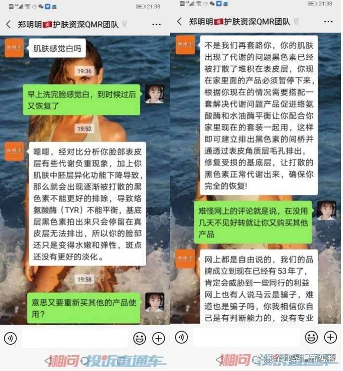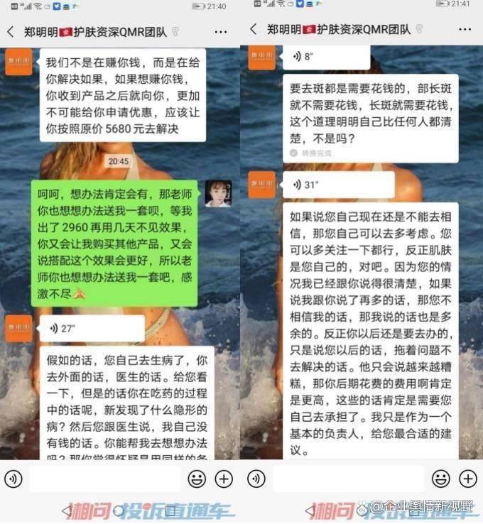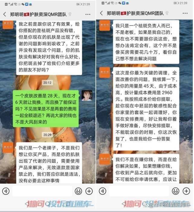 在《湘问投诉直通车平台》上,来自山西临汾的网友2021年5月发帖投诉该企业,称:“本人在2020年前后买了两套护肤品,都是从郑明明这个买的,才开始买了一套,用了大约十天没有效果,她又以毛孔堵塞无法吸收为由,让我买另一套。并且保证这两套用完,就可以改善好,并且夸大产品功效。我跟着美导一步一步改善,用完之后并没有改善好。她却说我的改善太慢,现在已经用完产品了无法改善。再问就不说话。”