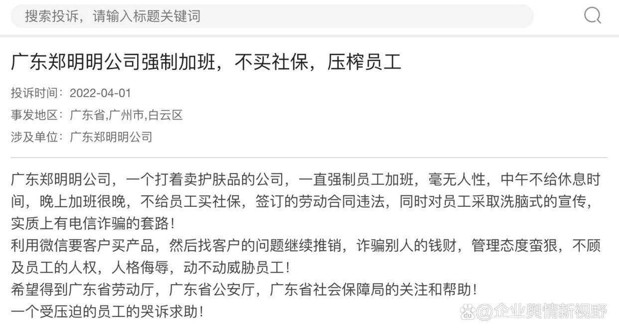 2022年4月1号来自郑明明内部公司的人投诉自己的公司,称;“广东郑明明公司,一个打着卖护肤品的公司,一直强制员工加班,毫无人性,中午不给休息时间,晚上加班很晚,不给员工买社保,签订的劳动合同违法,同时对员工采取洗脑式的宣传,实质上有电信诈骗的套路!利用微信要客户买产品,然后找客户的问题继续推销,诈骗别人的钱财,管理态度蛮狠,不顾及员工的人权,人格侮辱,动不动威胁员工!希望得到广东省劳动厅,广东省公安厅,广东省社会保障局的关注和帮助!一个受压迫的员工的哭诉求助!”