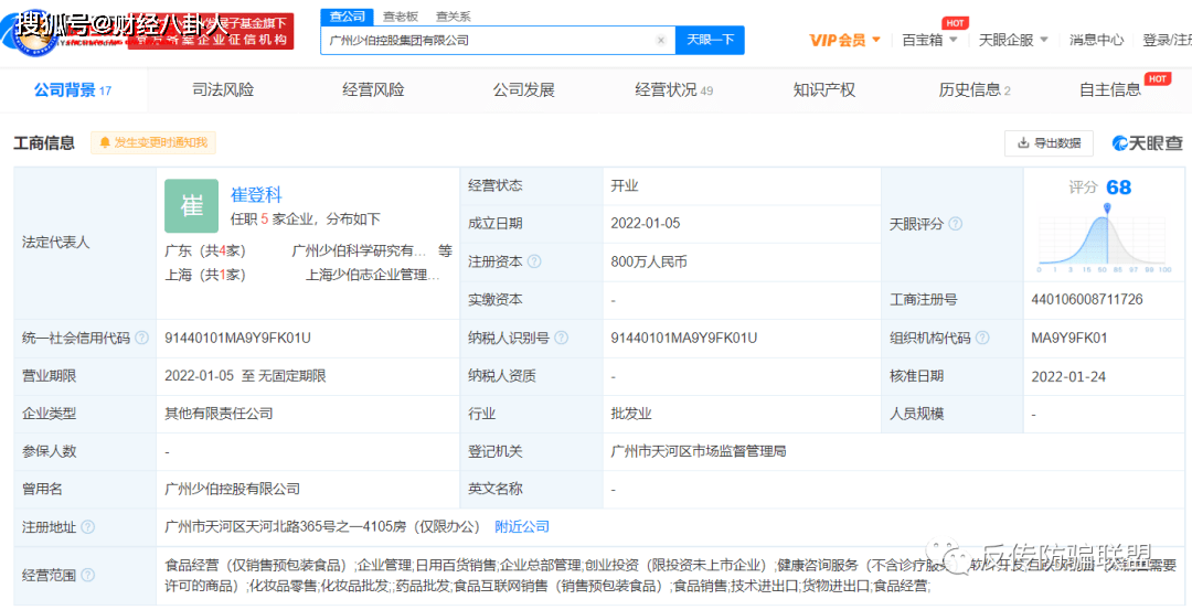 据天眼查显示,广州少伯控股集团有限公司成立于2022年1月5日,位于广州市天河区天河北路365号之一4105房,注册资本800万,实缴不详,法人代表崔登科任执行董事、经理,持股71.8443%,王一飞任监事,持股16.5%。