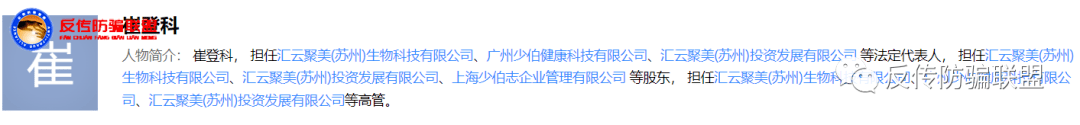 据爱企查显示,崔登科任汇云聚美(苏州)生物科技有限公司、广州少伯健康科技有限公司、汇云聚美(苏州)投资发展有限公司法定代表人,任汇云聚美(苏州)生物科技有限公司、汇云聚美(苏州)投资发展有限公司、上海少伯志企业管理有限公司股东, 同时还担任汇云聚美(苏州)生物科技有限公司、广州少伯健康科技有限公司、汇云聚美(苏州)投资发展有限公司高管。