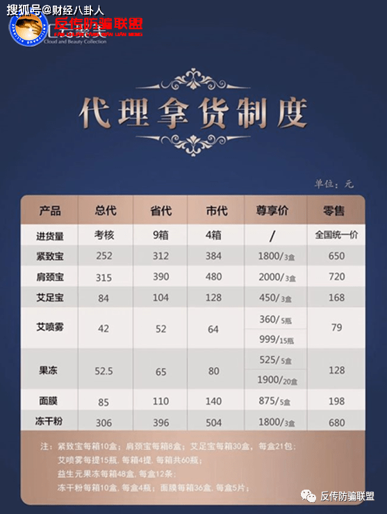 成为汇云聚美代理后除零售赚取差价外,还可以通过招募代理获得利益。以知情人士提供的总代返利制度为例:招募直属总代理商,公司返利16元/盒,隔代返利10元/盒,再隔代返利10元。
