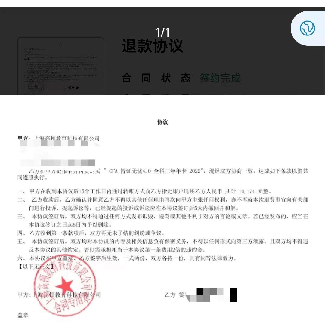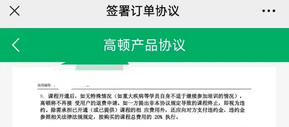 更令王艳生气的是,等还完贷款去找高顿教育退费的时候,高顿教育说要按20%违约金扣除学费,然后又说即使只上了不到10节课,但是因为给开通了第一个阶段的课(一共3阶),所以算下来只能退10174元。