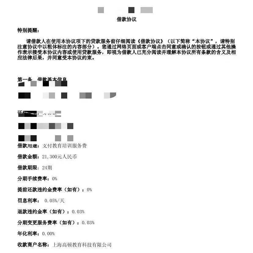 贷款?此时的王艳才知道,当初的扫脸、绑卡其实就已经签订了贷款协议。“如果不是因为申请退课退费,我都不知道有这个协议的存在。而且这个协议最后的签名也不是我个人签的,是他们用电子签名印上去的,钱也没有直接到我卡上。”王艳无奈地说。
