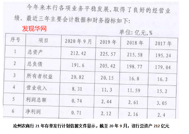 业绩方面,2017-2020年,该行净利润下行压力较大。沧州农商行2017年总营收15.2亿元,净利润2.4亿元;2020年9月末,该行资产总额是212.4亿元,比2019年末增长约10%,但20年前三季度实现营收只有8.3亿元、净利润仅0.71亿元。