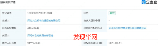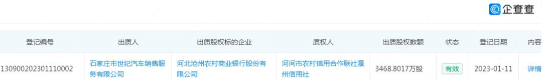 另外,企查查显示,石家庄市世纪汽车销售服务有限公司同样把持有的沧州农商行3468万股股权质押给了河间联社瀛州信用社,股权出质登记日期也是2023年1月11日。两家公司是否存在一致行动人关系?或有待沧州农商行的调查。