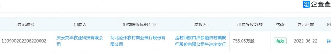 类似操作还不少。企查查显示,庆云英华农业科技有限公司持有沧州农商行0.4665%的股权。2022年6月,庆云英华把沧州农商行全部股权质押给孟村回族自治县融信村镇银行牛进庄支行。而孟村融信村镇银行的大股东也是沧州农商行。