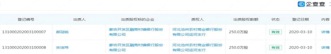 比如公开信息显示,2020年3月,郝冠铭、宋洁玮把持有的廊坊开发区融商村镇银行(现更名为“廊坊开发区融信村镇银行”)共500万股股权,质押给沧州农商行运河支行。企查查显示,沧州农商行持有廊坊开发区融信村镇银行32.5%的股权。