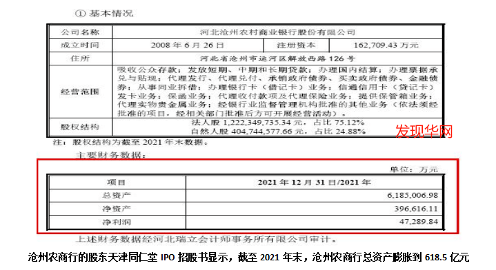 但据沧州农商行股东之一的天津同仁堂股份有限公司招股书披露,截至2021年底,沧州农商行的总资产达618.5亿元,年度净利润4.72亿元。