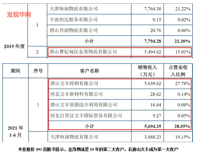 类似的情况还不少。沧州农商行的第三大股东是唐山曹妃甸区金茂物流有限公司。金茂物流的公开信息不多,唐山曹妃甸木业股份有限公司IPO招股书显示,金茂物流是木业股份2018、2019年的第二大客户,后退出;2021年,木业股份的最大客户变为唐山文丰特钢有限公司。据媒体报道,金茂物流和文丰特钢有着一致的联系电话、相同的邮箱前缀。招股书显示,金茂物流、文丰特钢没有关联方关系。可能吗?招股书透露,金茂物流“仅服务文丰特钢一家客户”。也就是说,至少业务上,两家企业高度绑定。