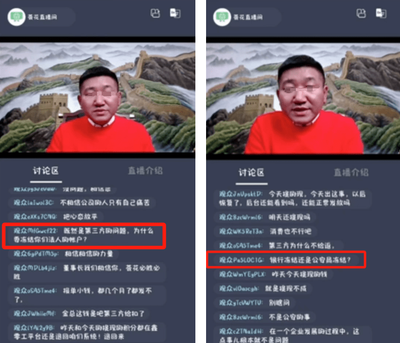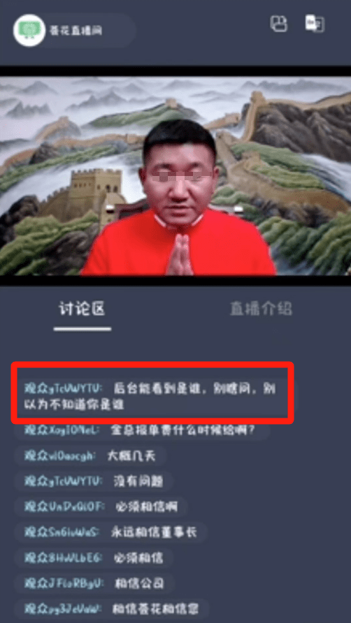 有意思的是胡广州在直播间提出让观看的会员提问一些“含金量高”的问题。没成想其话音刚落,记者就注意到评论区出现了这样一条留言:“后台能看到是谁。别瞎问,别认为不知道你是谁”,随后,会员们纷纷打出“永远相信董事长”、“我们相信公司”、“荟花是百年企业”、“公司一开始就合法”、“别的平台嫉妒可能”等等的弹幕。