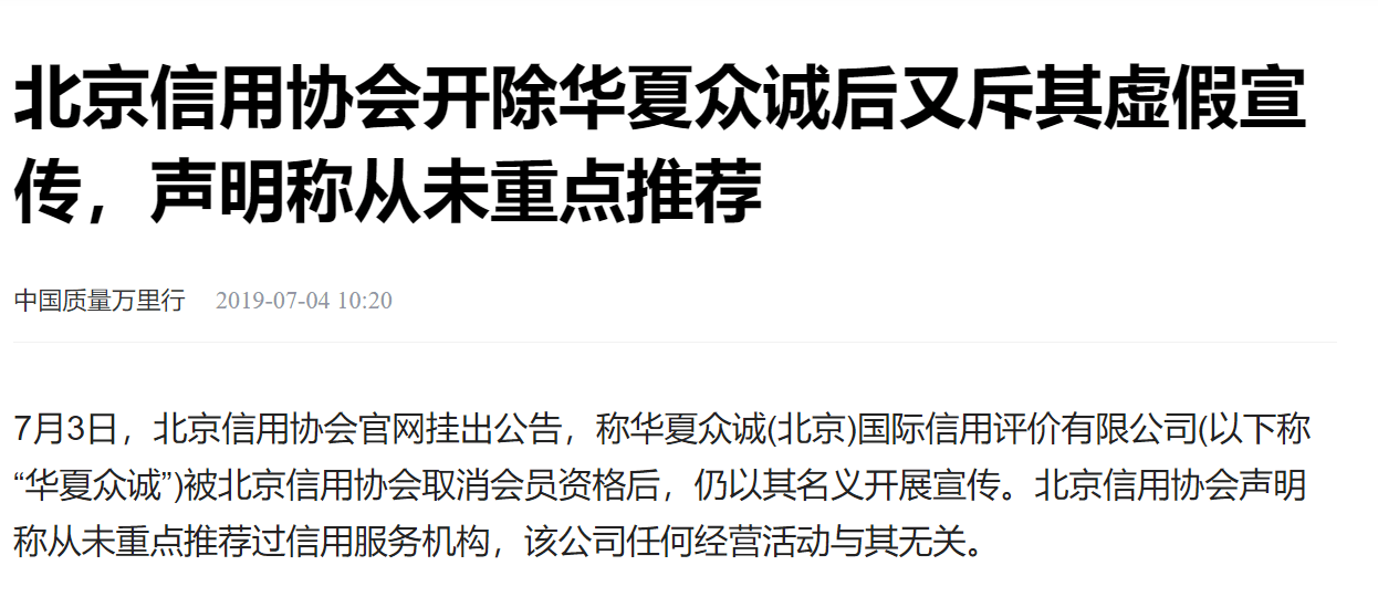 据《中国质量万里行》报道,2019年5月30日,北京信用协会向华夏众诚(北京)国际信用评价有限公司发出《关于取消华夏众诚(北京)国际信用评价有限公司会员资格的通知》,因其在经营活动中违反了其向北京信用协会签署的诚信承诺书,采取不正当竞争手段,以打包方式和超低价格销售信用报告,严重扰乱了信用服务市场秩序,北京信用协会决定将其除名。而所谓的“商务诚信公共服务平台”当时名称为“中国商务诚信公共服务平台”乃华夏众诚旗下网站。