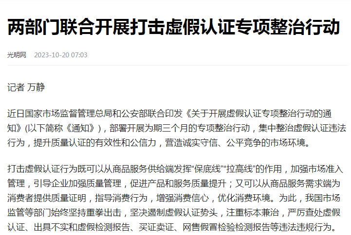 近日国家市场监管总局和公安部联合引发《关于开展虚假认证专项整治行动的通知》部署开展为期三个月的专项整治行动,严厉查处虚假认证、出具不实和虚假检测报告、买证卖证、网售假冒检验检测报告等违法违规行为。