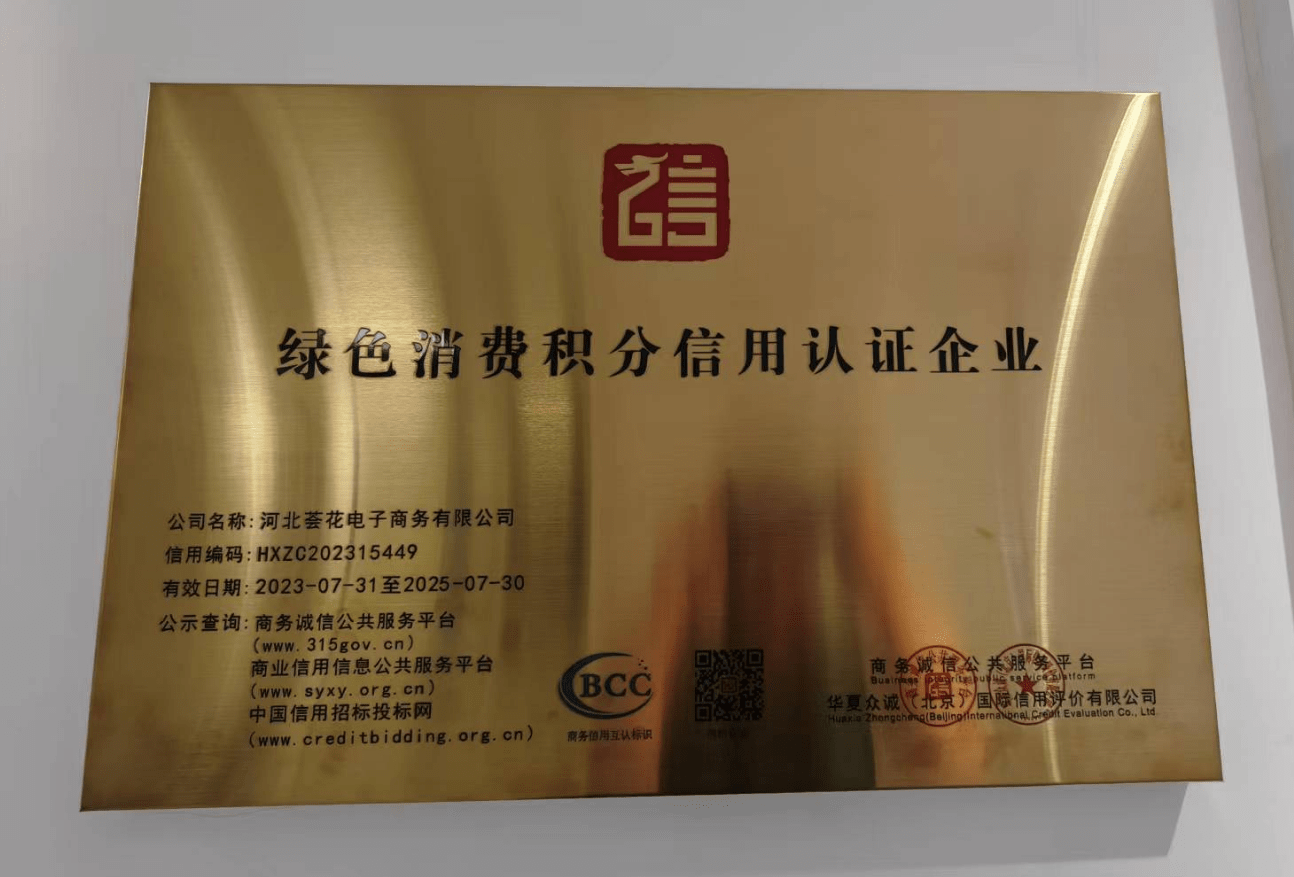 在河北荟花贸易有限公司,调查员看到一块授予河北荟花电子商务有限公司“绿色消费积分信用认证企业”的牌匾。