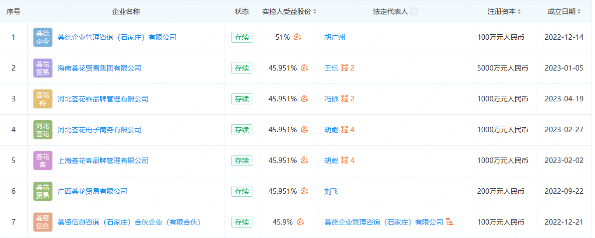“企查查”信息显示:海南荟花贸易集团有限公司成立于2023年1月5日,法定代表人王乐,股东荟贤信息咨询(石家庄)合伙企业(有限合伙)、荟德企业管理咨询(石家庄)有限公司,胡广州为监事,胡彪为财务负责人。企业族群显示“荟德企业”旗下还有河北荟花客品牌管理有限公司、河北荟花电子商务有限公司、上海荟花客品牌管理有限公司、广西荟花贸易有限公司,共7家成员企业,注册资本从100万元人民币-5000万元人民币不等,实缴资金不详。