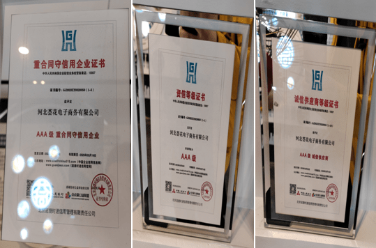 发现河北荟花电子商务有限公司再获“殊荣”,“AAA级重合同守信用企业”、“AAA级诚信供应商”、“资信等级AAA级”、“AAA级立信单位”、“AAA级诚信经营示范单位”、“AAA级质量、服务诚信单位”、“电子商务行业AAA级诚信单位”等。