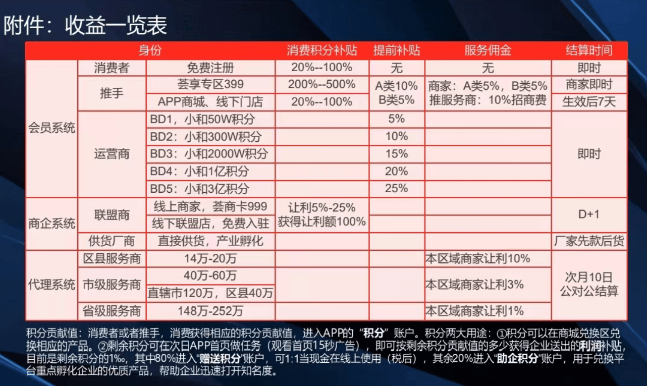 不仅如此,推荐商家花费999元购买荟商卡成为入驻商家时,商家售卖产品可以选择让利5%-25%,当商家让利20%时,消费用户在该商家消费1000元,商家可以获得800元现金和200积分,同时消费者获得消费金额的80%积分。推广商家入驻参与让利可以获得两级推广商家让利金额的5%分红,以花果的形式发放可以直接提现。推手用户还申请成为区域服务商,分别为区县、市级、省级,分别对应可以得到10%、3%、1%的让利佣金分红。推手用户推荐朋友成为区域服务商可以拿到10%的现金提成。同时只要有区县代理申请,省级代理就可以拿到10%的招商提成,市级代理可以拿到20%的招商提成。