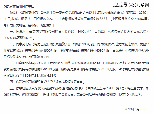 值得注意的是,魏县农村信用合作联社请示邯郸银保监分局,请求变更河北泰绿园林绿化工程有限公司、河北善美商贸有限公司、河北标马电力工程有限公司等持股比例百分之五以上股东,于2019年9月26日获核准。监管要求,魏县联社应认真落实《商业银行股权管理暂行办法》监管要求,加强股权管理,严格控制股东关联交易,防范和化解风险。