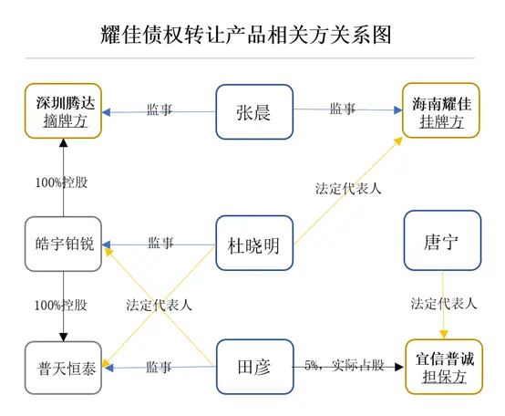 此外,海南耀佳法定代表人杜晓明,不仅是深圳腾达的全资股东皓宇铂锐资产管理(北京)有限公司(下称“皓宇铂锐”)的监事,还是皓宇铂锐另一子公司——深圳普天恒泰资产管理有限公司(下称“普天恒泰”)——的法定代表人。