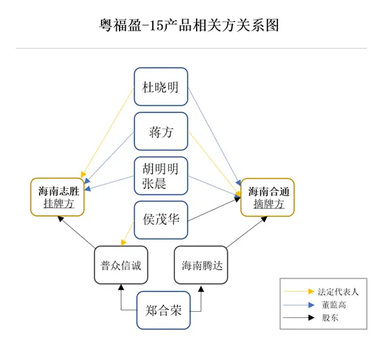 在另一产品“粤福盈-15”中,关联关系更为直接。该产品挂牌方为海南志胜商业投资股份有限公司(下称“海南志胜”),摘牌方为海南合通复鑫投资股份有限公司(下称“海南合通”)(图2)。