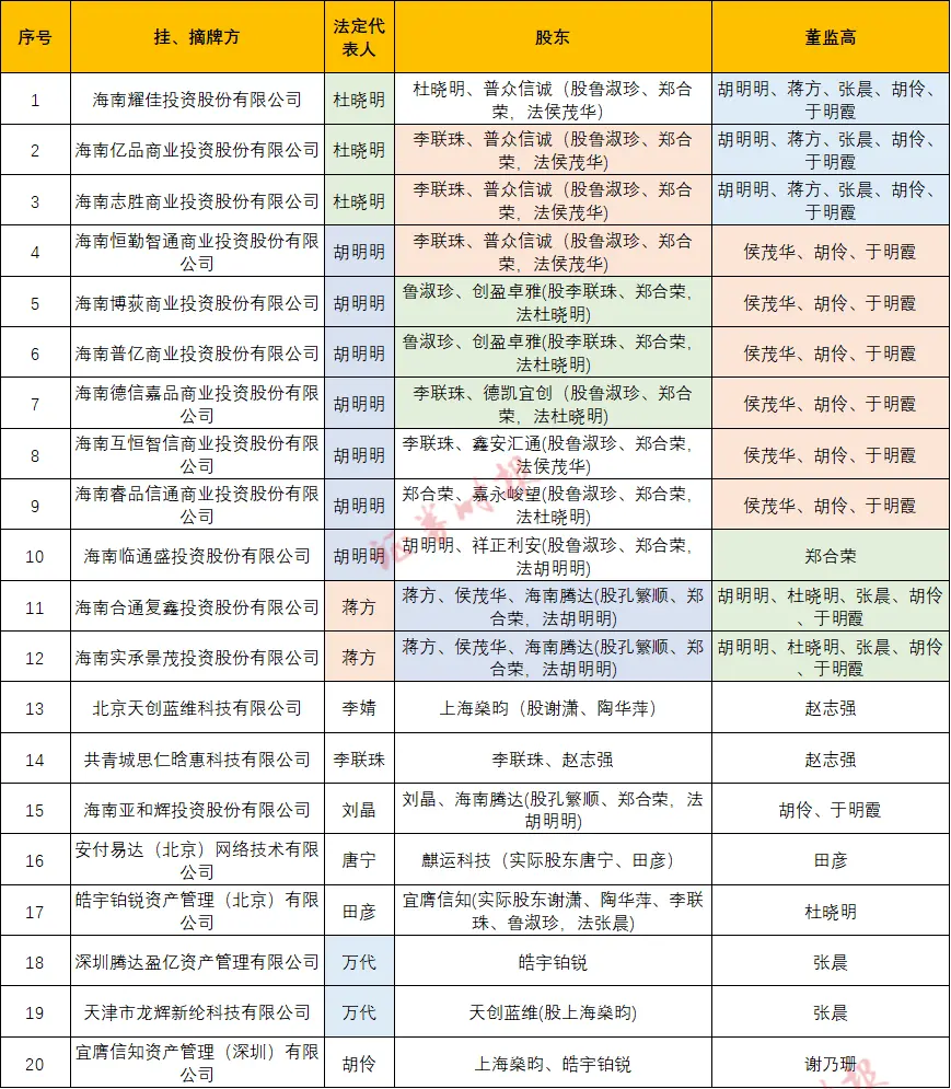证券时报记者统计,32款类固收产品共涉及20家挂、摘牌方公司(表2)。其中胡明明是7家公司的法定代表人,杜晓明是3家公司的法定代表人。李联珠、郑合荣、鲁淑珍三人一同或单独出现在20家公司中的16家公司股东名单中,胡伶一人位列14家公司董监高名单。