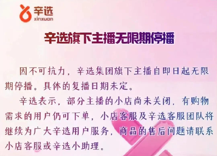 第二天,辛巴的徒弟蛋蛋在直播的时候,突然接到师傅指令,紧急停播。随后,网上传出了辛选集团旗下主播无限停播的通知。