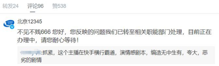 对于相关举报,@北京12345 则回复称:“反映的问题已转至相关职能部门处理。”