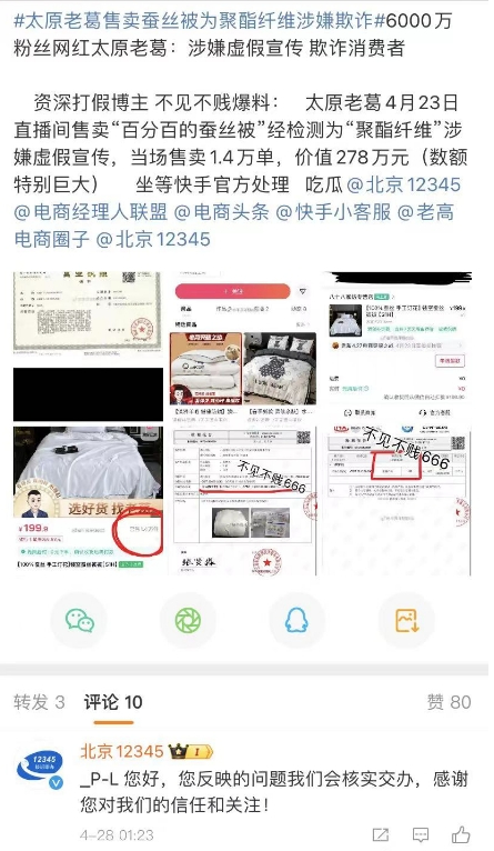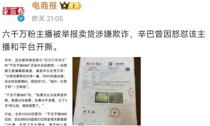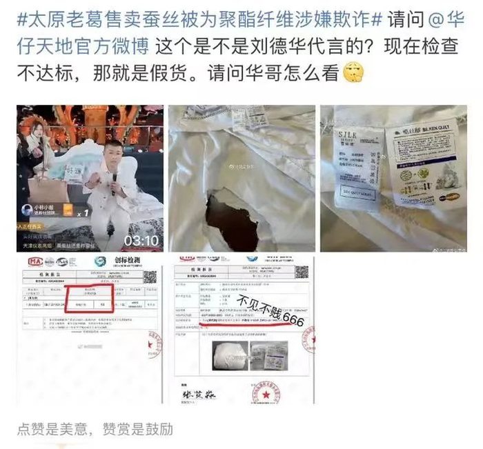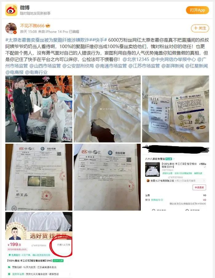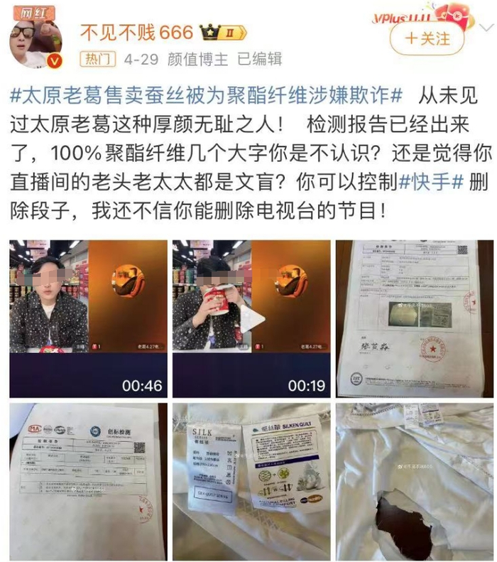 博主 @不见不贱666 发文称,太原老葛把 100% 的聚酯纤维当成 100% 蚕丝来卖,简直愧对粉丝的信任。