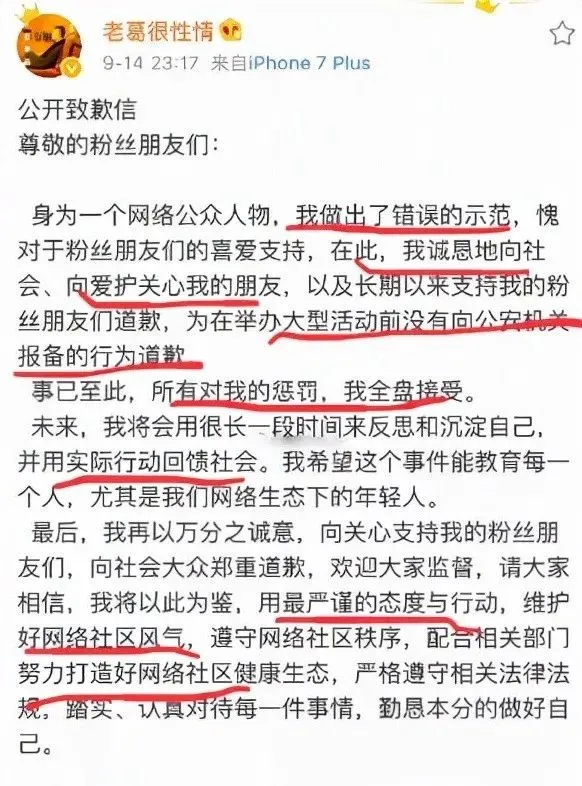 他前期靠着和网红“约架”积累了几百万粉丝,结果,在一次约架的时候被举报了,不得不出面道歉,承认那是策划的剧本,被平台封了 2 年。