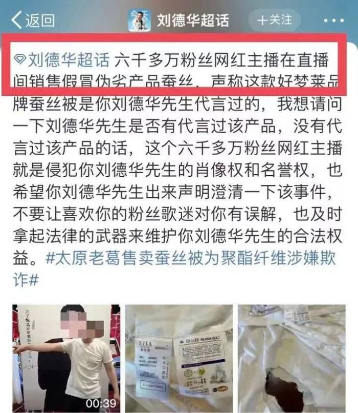 太原老葛在直播中搬出刘德华做宣传,称这款蚕丝被是他代言的。