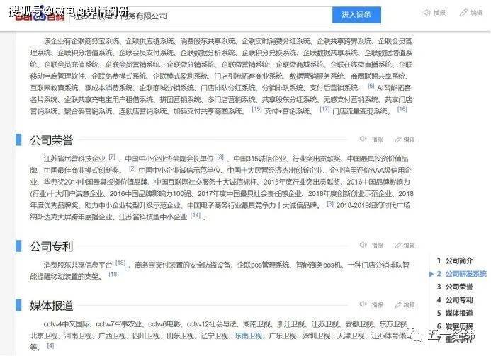 据企业简介介绍,江苏企联有商圈联盟共享系统、店盈宝系统、零成本消费系统、企联商城分销系统等42项研发系统以及5项公司专利。同时被央视多频道及多家卫视报道,荣获多项荣誉。
