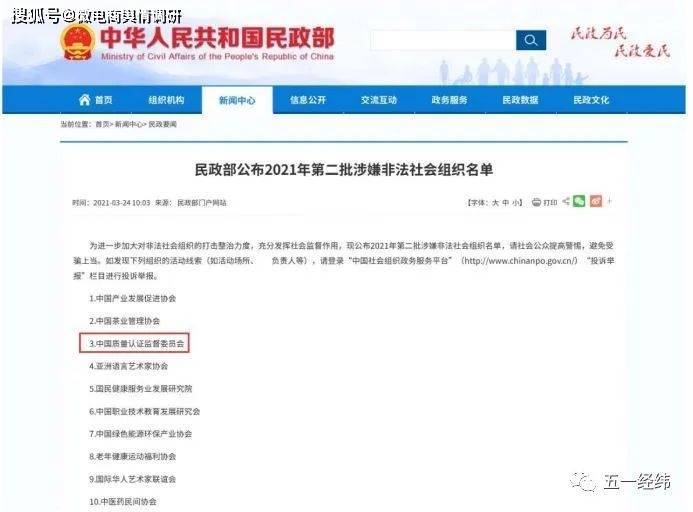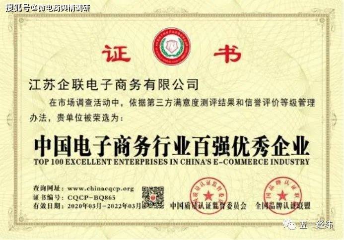 五一在线随机查询了2016年中国品牌影响力100强企业,同样未查询到该企业上榜。该公司宣传的2020年3月荣获由中国质量认证监督委员会和全国品牌认证联盟颁发的《中国电子商务行业百强优秀企业》,根据证书查询网址,五一在线搜索发现该网址(www.chinacqcp.org)是一家注册于英属维尔京群岛的博彩网站,且中国质量认证监督委员会被民政部列入非法社会组织名单。