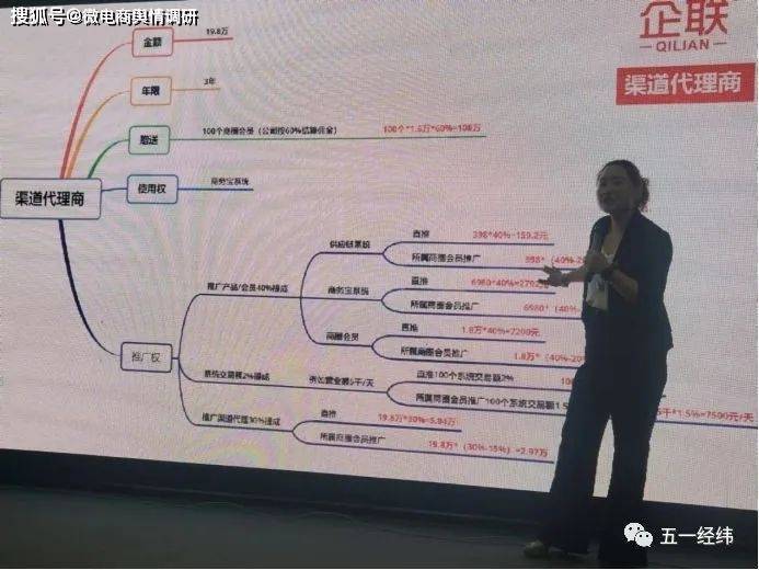 举报人表示,江苏企联除了在网上自己宣传自己以外,在线下更多的是通过会员的亲身经历、讲师宣讲、发展下线的模式推广他们的商务宝、店盈宝。只不过江苏企联做的更巧妙一点,以拓客(拓展客户)、赋能、盈利为诱饵,通过公司(小微企业)加盟模式来发展自己的会员(渠道代理商),其渠道代理商的代理费一般是3年19.8万元。