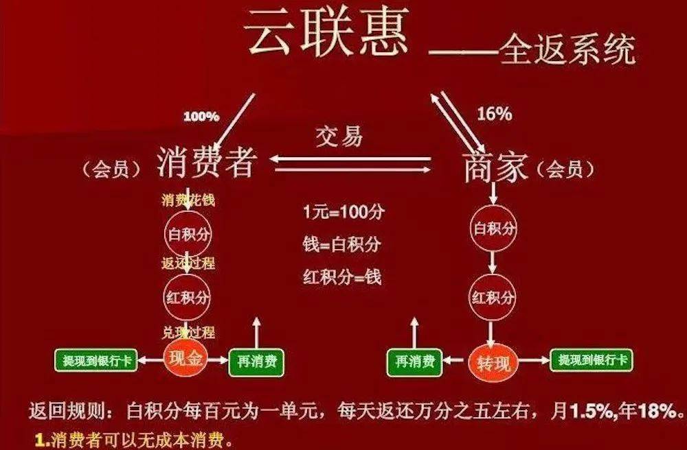 根据云联惠的积分返还模式,会员通过云联惠平台购买商品,商家要向平台缴纳每笔交易额的16%作为佣金。从消费后的次日,平台开始以0.05%左右的返还比例,将消费额和佣金以积分转换形式返还给消费者和商家。