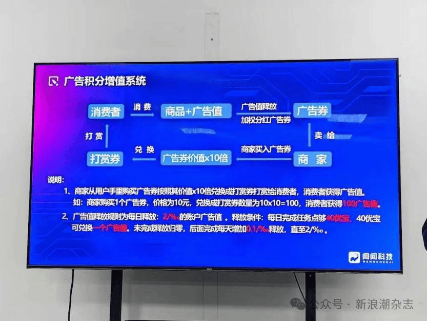 据新浪潮记者了解,在闻闻电商的“广告积分增值系统”中总共有消费者和商家两个角色,消费者通过消费可以获得商品和广告值,广告值每天释放,消费者能够以加权分红的方式把广告值转换成广告劵,广告劵又可以卖给商家来进行变现。