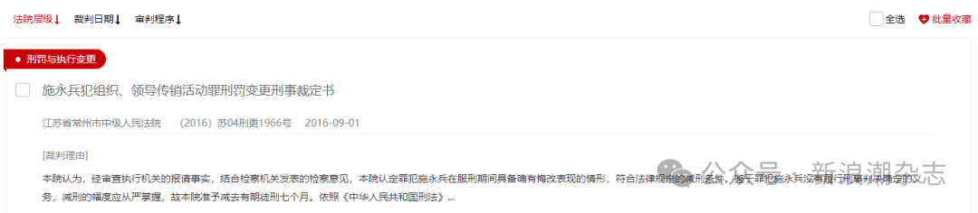 新浪潮记者查询中国裁判文书网发现,《施永兵犯组织、领导传销活动罪刑罚变更刑事裁定书》显示,镇江市京口区人民法院于2016年9月1日判决罪犯施永兵的刑罚减去有期徒刑七个月(减刑后的刑期至2017年1月7日止),处罚金人民币一千万元不变。