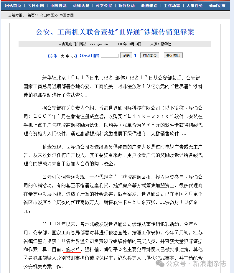 2009年10月13日,中国政府网引用新华社发布的《公安、工商机关联合查处“世界通”涉嫌传销犯罪案》一文,该文章详细指出世界通作案过程,并查获大量犯罪证据和作案工具。施永兵、强科信、傅衍平3名主要犯罪嫌疑人被批准逮捕,其他7名犯罪嫌疑人分别被刑事拘留或取保候审。