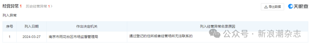 新浪潮记者注意到,3月27日,江苏闻闻网络科技有限公司因“登记的住所或者经营场所无法联系”,以被南京市雨花台区市场监督管理局列入经营异常。