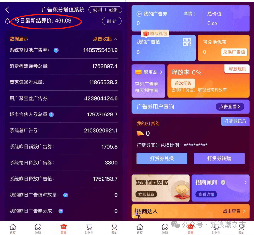 被广平县市监局公开征集涉嫌传销的线索之后,新浪潮记者登录闻闻APP发现,“广告积分增值系统”依旧存在,且每天都会更新当日的最新结算价。