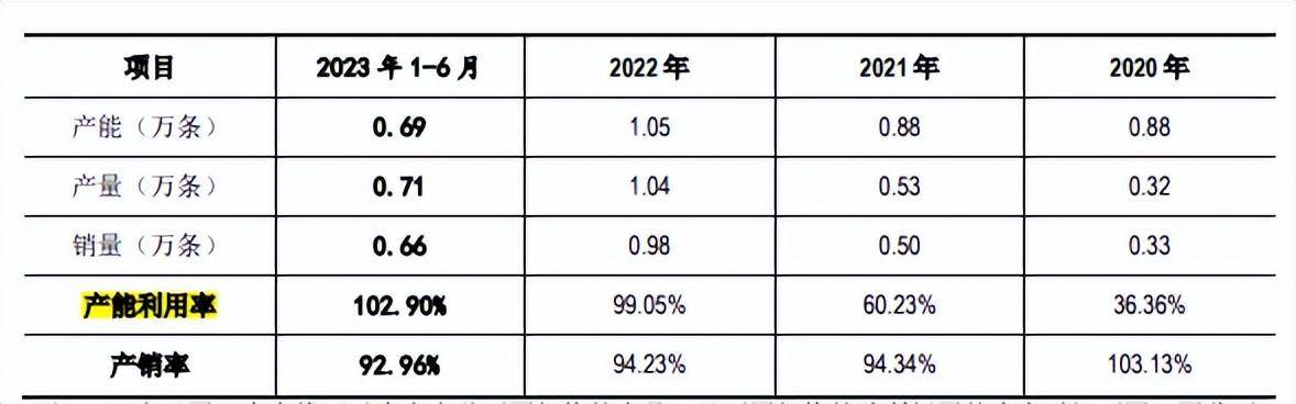 海安橡胶由于同一生产线可以生产多种不同规格的产品,且不同规格轮胎所耗用的生产时间不同,因此不同规格产品按照一定系数折算至37.00R57英寸规格进行计算。报告期内,其产能、产量及销量情况来看,产能利用率显现飙升的情况;2020年产能利用率未过四成,2021年刚过六成,2022年即达百分百。