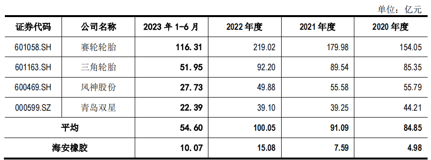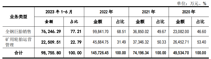 海安橡胶的主营业务包括巨型全钢工程机械子午线轮胎的研发、生产与销售,以及矿用轮胎运营管理业务。目前主要由法国米其林、日本普利司通、美国固特异等国际轮胎巨头企业所垄断,国际三大品牌全球市场份额维持在85%以上。2020年-2023年1-6月,海安橡胶营业收入分别为4.985亿元、7.591亿元、15.083亿元以及10.072亿元,净利润分别为4492.70万元、7,945.44万元、3.54亿元以及2.92亿元。