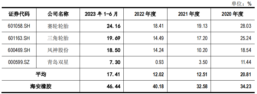 报告期内,公司综合毛利率分别为34.28%、31.65%、38.56%以及45.48%,存在一定的波动,主要受公司产品价格、产能利用率、原材料价格等多方面因素影响。与可比同行均值相比,海安橡胶的毛利率要远超可比同行,最多近30个点。