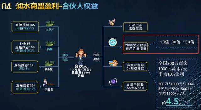 3月24日,记者来到润水公司总部,从润水公司举办的推介会上了解到,消费者在其开发上线的微信小程序上(以下简称“润水APP”)消费1000—5000元可以获得消费金额2倍的贡献(值)积分;消费6000——20000元可以获得消费金额3倍贡献(值)积分;消费21000——50000(以上)元可以获得消费金额4倍贡献(值)积分。消费行为完成后,润水APP会将每日消费金额的千分之五转换成绿色积分并汇入个人账户,例如消费1000元,每天就有5绿色积分进入个人账户。“虽然是绿色积分,但是和钱是一样的。”润水公司的推介讲师告诉记者。