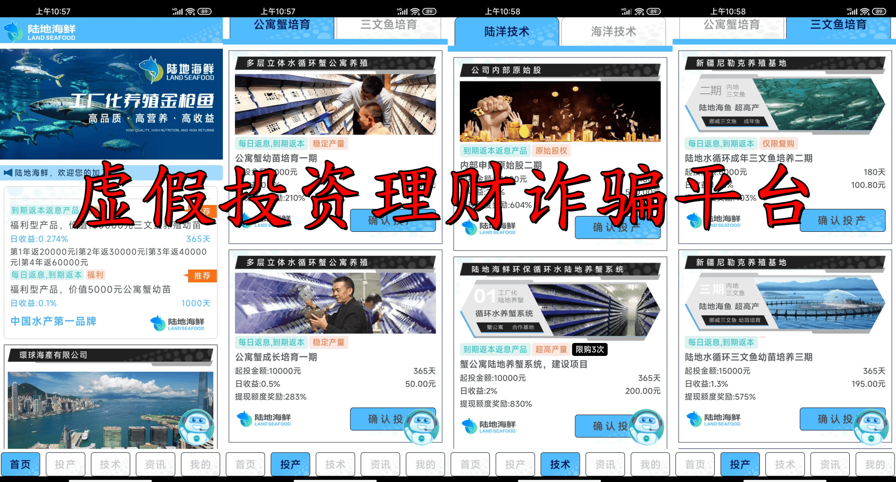 据张先生提供的资料了解到,该项目宣称与多家养殖海鲜基地合作,通过线上线下讲课,宣传投资“公寓蟹培育”、“金枪鱼培育”、原始股等项目,可以获得年利率36.5%—1022%的超高额回报,宣称每日返息,到期返本。