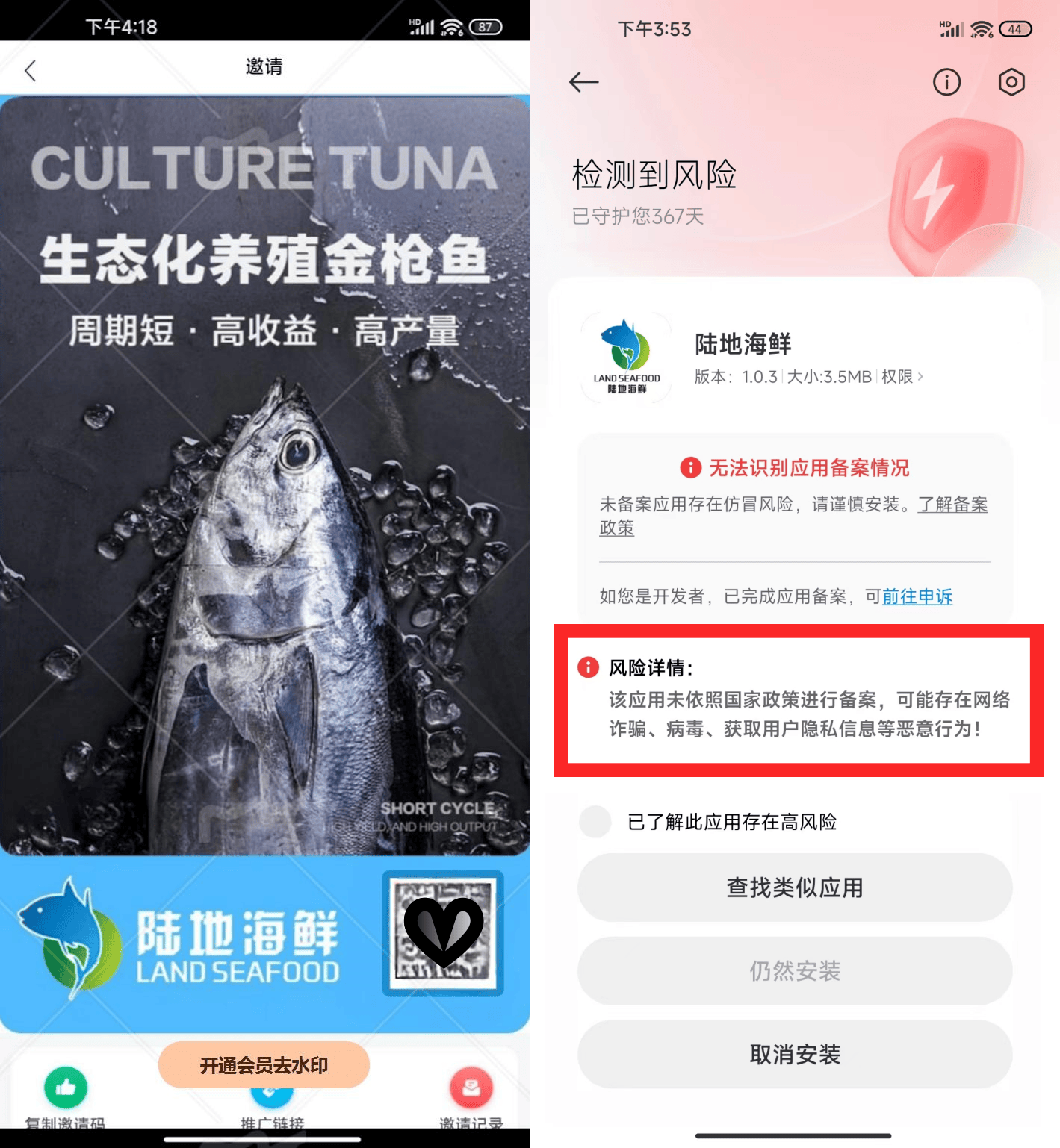 第一,无法通过正常应用商城下载,必须由上线二维码、链接下载;下载提示:该应用未依照国家政策进行备案,可能存在网络诈骗、病毒、获取用户隐私信息等恶意行为!