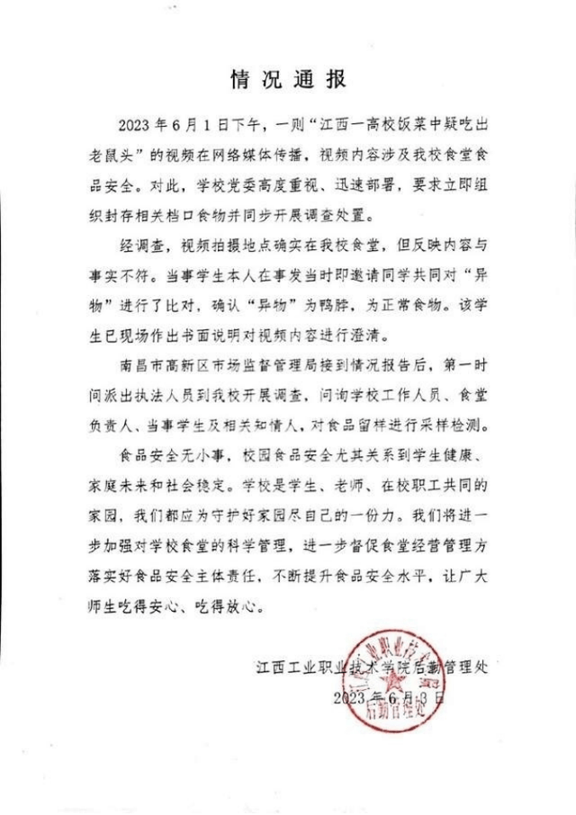 6月3日晚,江西工业职业技术学院发布通报称,学生本人已确认“异物”为鸭脖,并澄清了视频内容。